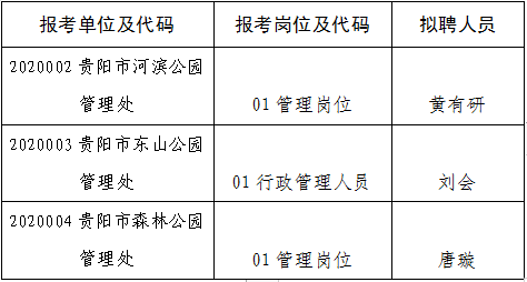 貴陽市綜合行政執(zhí)法局2020年公開招聘局屬事業(yè)單位工作人員已通過筆試、專業(yè)測試、面試、體檢、考核階段。經(jīng)審核,以下人員符合聘用條件,現(xiàn)予以公示: