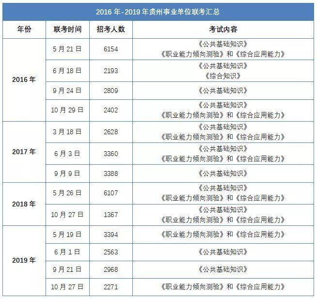 以下為2016-2019年貴州事業(yè)單位聯(lián)考時間、招考人數(shù)及筆試科目一覽表